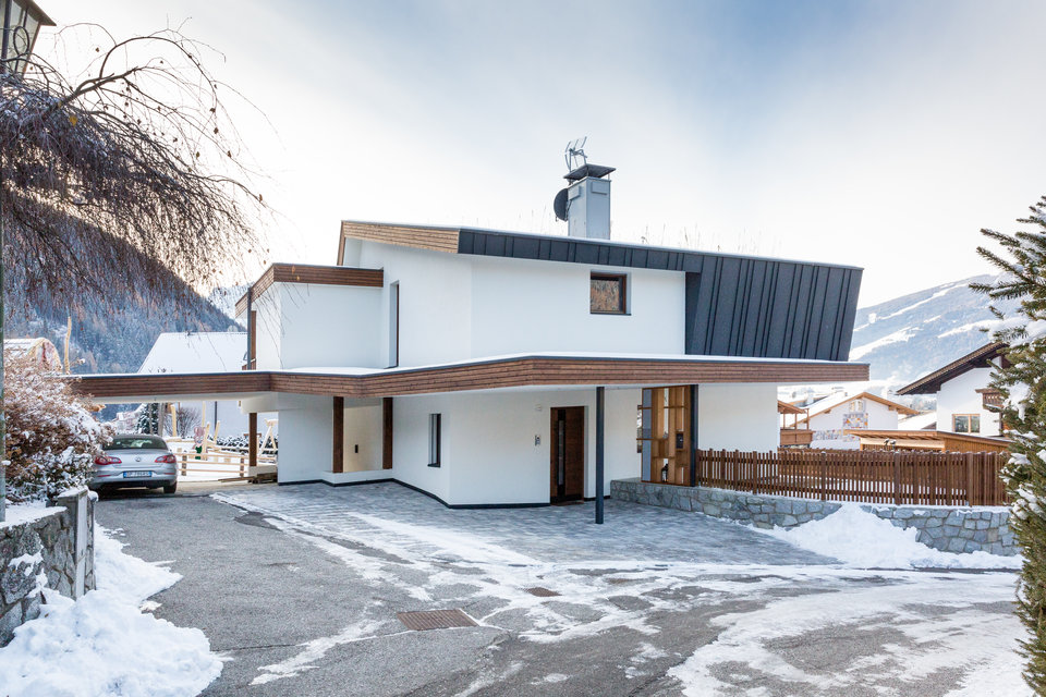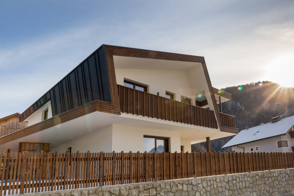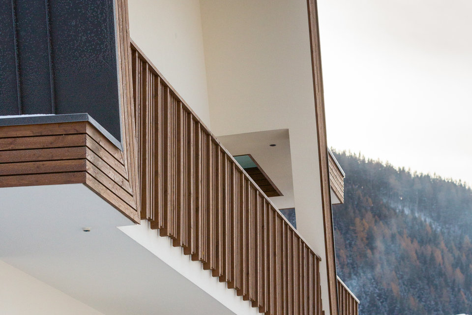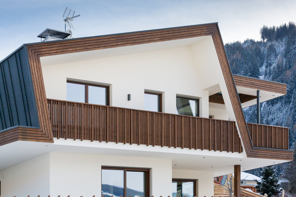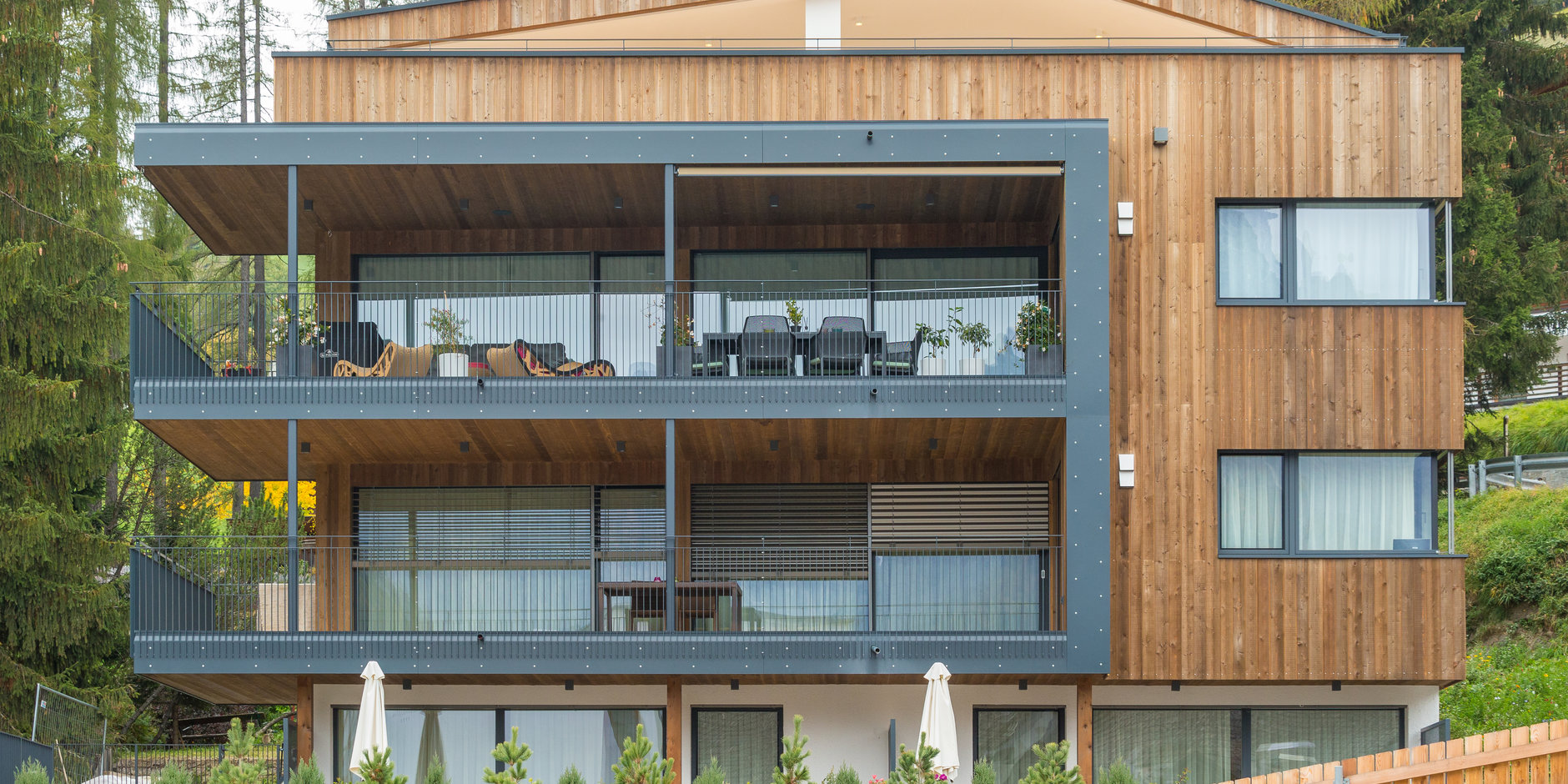 Großzügige Balkone und lichtdurchflutete Räume sorgen für Wohlfühlatmosphäre im modernen Einfamilienhaus. Das gesamte Gebäude ist in Massivholzbauweise ausgeführt. Hier wird das Element Holz zeitgemäß in Szene gesetzt. Ein besonderes Highlight: das begrünte Steildach. Es betont die nachhaltige Bauweise des Projekts.