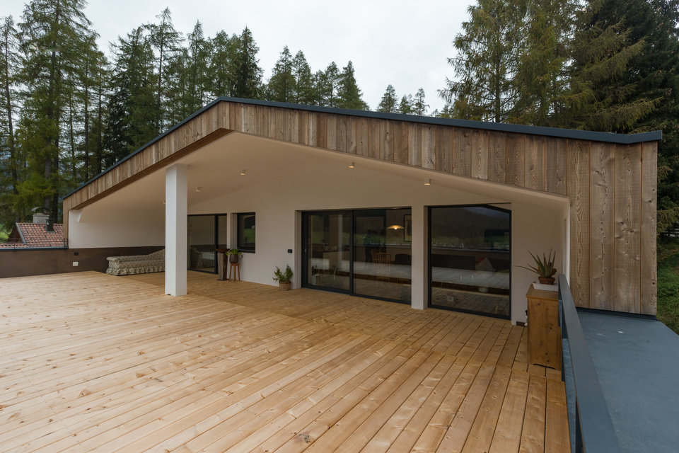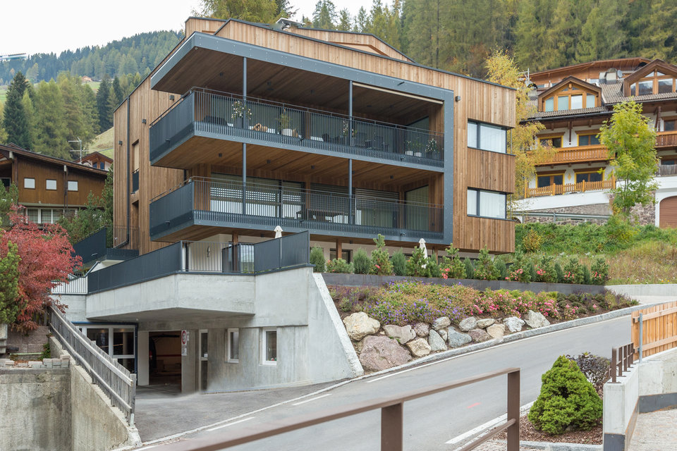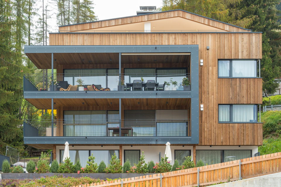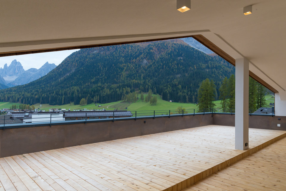 Das Wohngebäude in St. Veit ist zur Gänze in Massivholzbauweise gefertigt. Die breiten Balkone und die Dachterrasse mit fantastischer Aussicht auf die Sextner Bergwelt laden dazu ein, die Zeit im Freien zu verbringen. Der Baustoff Holz holt dieses natürliche Wohlgefühl in die eigenen vier Wände.
